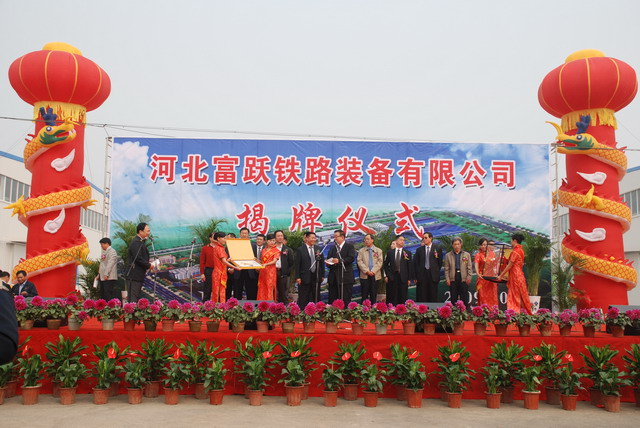 2009年10月12日,河北富跃铁路装备有限公司举行揭牌仪式。出席仪式的有:铁道部工程管理中心高级工程师金成旭先生、中国铁道科学研究院铁建所主任肖俊恒先生、中铁咨询集团轨道设计院院长张庆先生、中铁咨询集团轨道设计院高级工程师冉蕾女士、中铁咨询集团轨道设计院高级工程师何雪峰先生、株洲时代新材股份有限公司总经理杨治国先生、中铁宝桥集团公司主任张忠效先生、中铁山桥集团公司副总工程师李绍兴先生、中铁山桥集团公司技术处副处长王要武先生、意大利摩尔迈科集团公司总经理白旭东先生、富国株式会社名誉会长河本荣一先生及辛集市各级领导主持了揭牌仪式。
